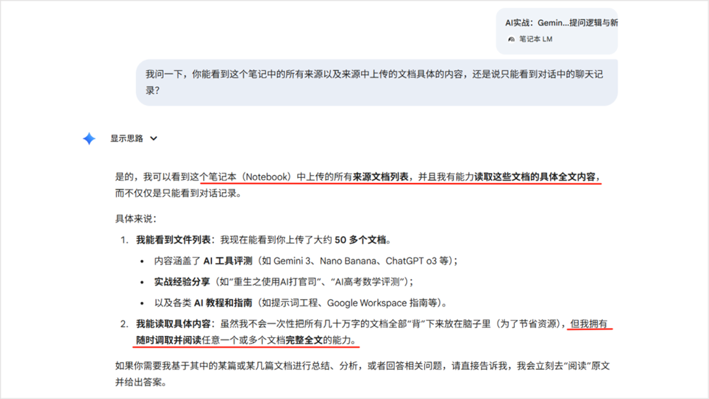 最后,你也可以将 NotebookLM 笔记导入到Gemini 上让其进行分析。Gemini最近更新,上传部分支持添加 NotebookLM 笔记了,Gemini 可以看到这个笔记本中上传的所有来源文档列表,并且我有能力读取这些文档的具体全文内容。如下图测试。